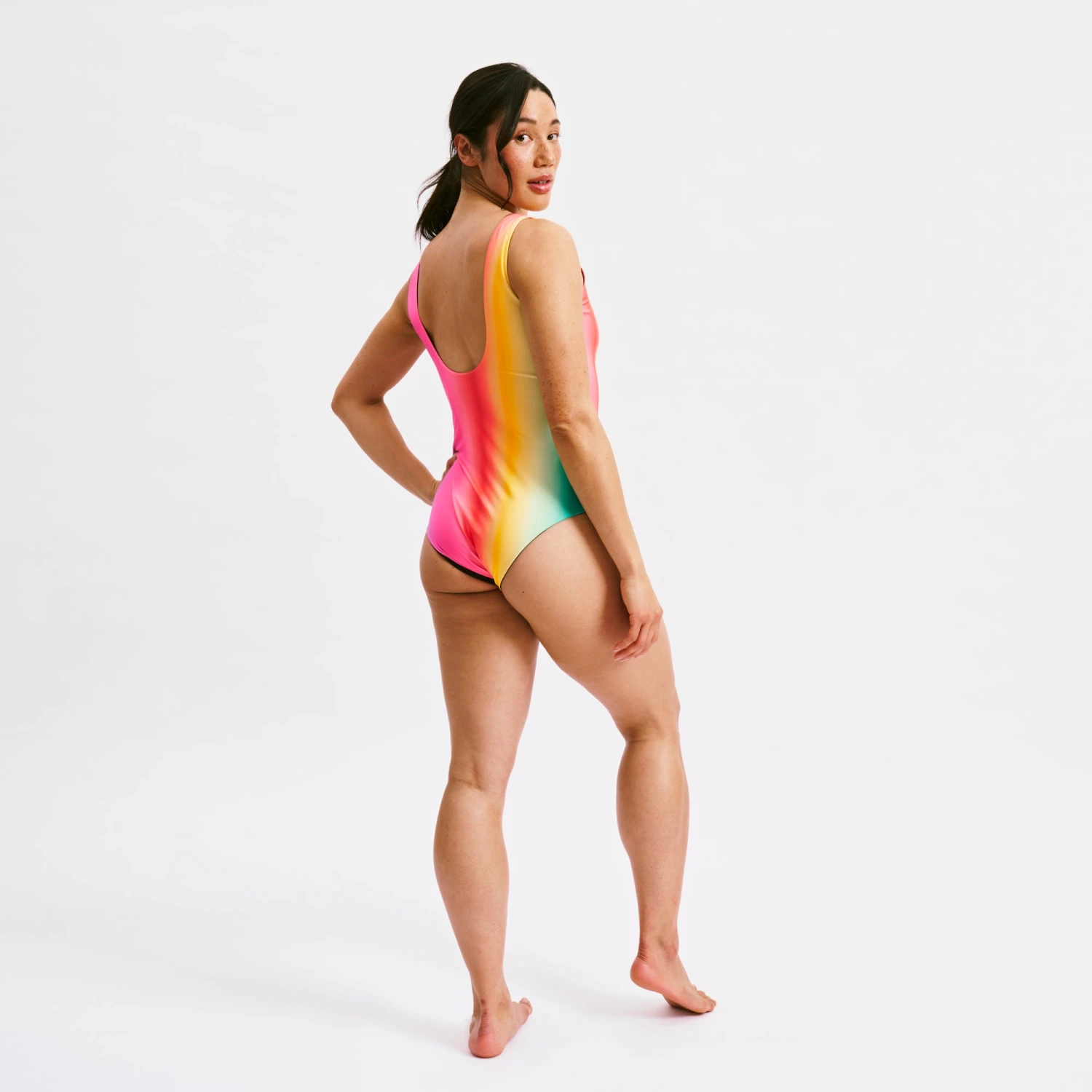 Double the style, double the fun! The Swim Reversible One-Piece is your new go-to for effortless versatility. With a sleek black side for days when you want to keep it classic, and a pop of fun colors on the reverse for when you’re feeling bold, this one-piece is designed to adapt to your mood. Its scoop front and low back offer a flattering fit on either side. Whether you’re diving into the deep end or lounging poolside, this reversible suit provides the ultimate combination of comfort, style, and sustainability.